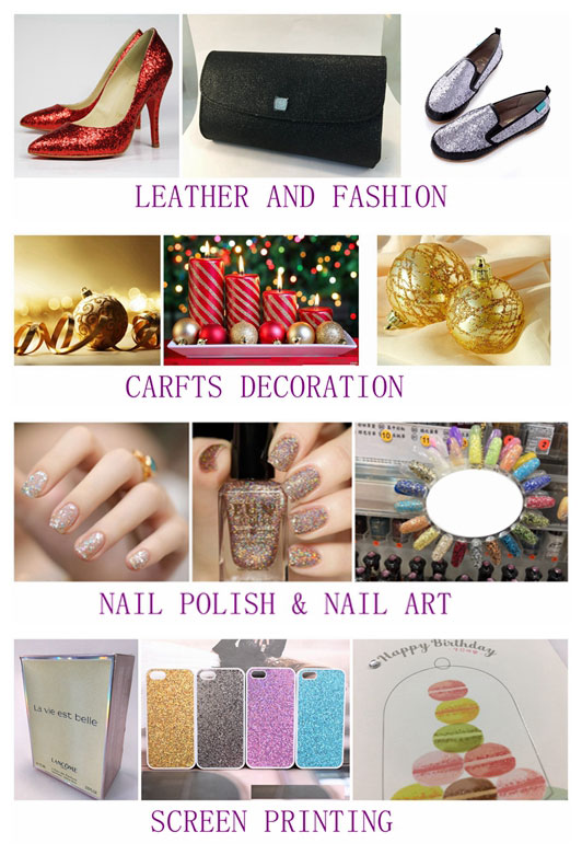 Fengcai glitter powder and special shaped glitters are widely applied in crafts decoration, printing, cosmetics, nail polish, glass, fashion, leather and so on.